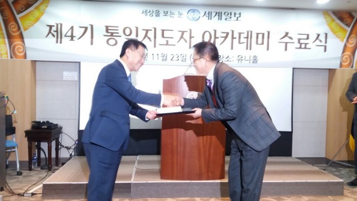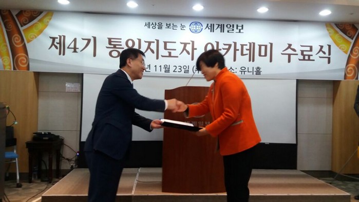 [세계일보 이우춘 조사팀장]세계일보가 지난 8월22일부터 11월 15일까지 10주에 걸쳐 진행한 제4기 통일지도자 아카데미 수료식이 23일 오후 본사 강당 유니홀에서 열렸다.
