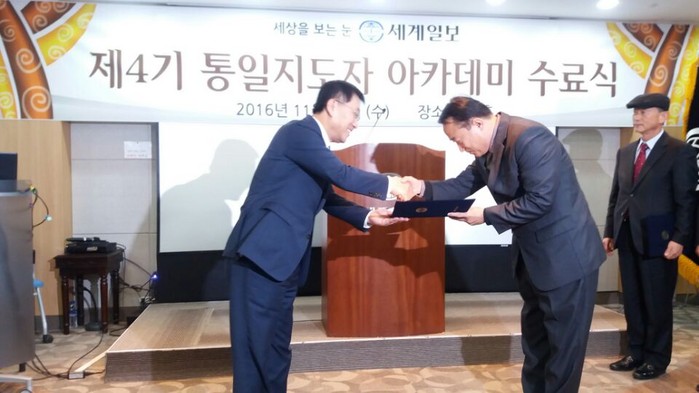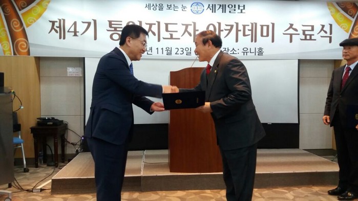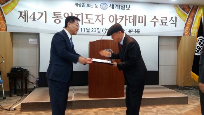 | ▲ 이규형 원우가 23일 오후 열린 제4기 통일지도자 아카데미 수료식에서 차준영 세계일보 사장으로부터 평화통일 지도자 위촉장을 받고 있다. |