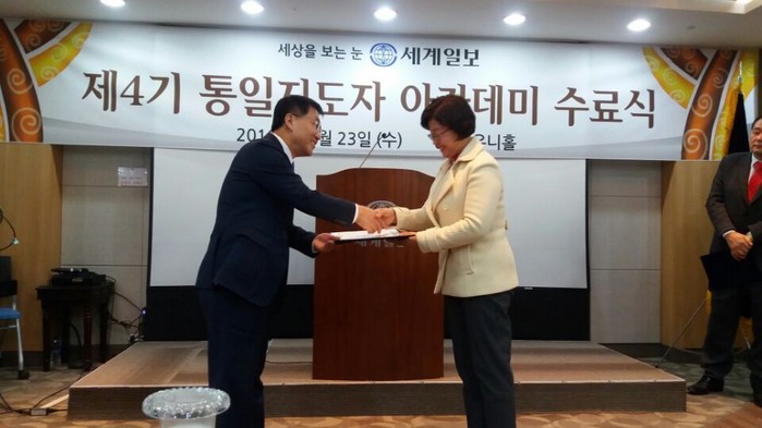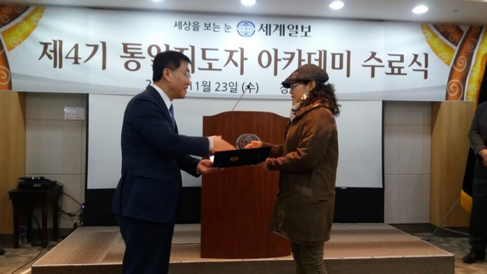 | ▲ 김성숙 원우가 23일 오후 열린 제4기 통일지도자 아카데미 수료식에서 차준영 세계일보 사장으로부터 평화통일 지도자 위촉장을 받고 있다. |