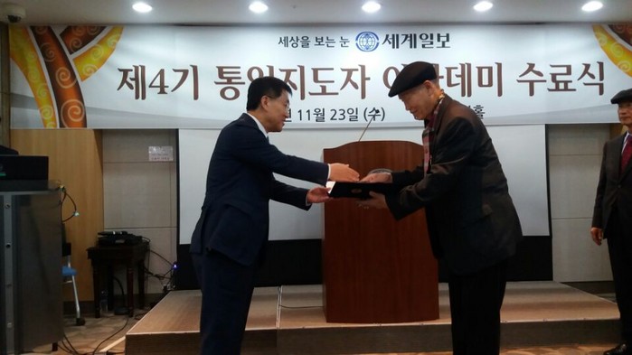 | ▲ 이배연 원우가 23일 오후 열린 제4기 통일지도자 아카데미 수료식에서 차준영 세계일보 사장으로부터 평화통일 지도자 위촉장을 받고 있다. |