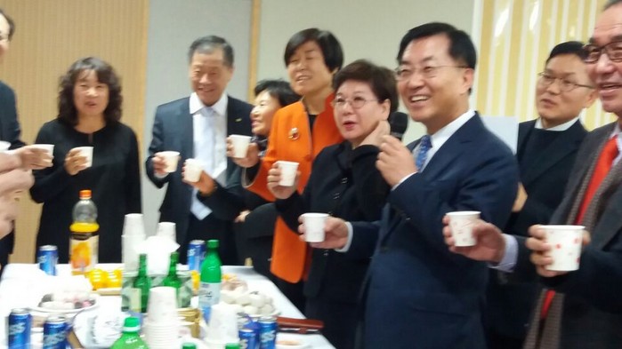 | ▲ 23일 오후 세계일보 유니홀에서 제4기 통일지도자 아카데미 수료식 후 진행한 다과회에서 차준영 사장(오른쪽서 세번째)이 건배사를 하고 있다. |
