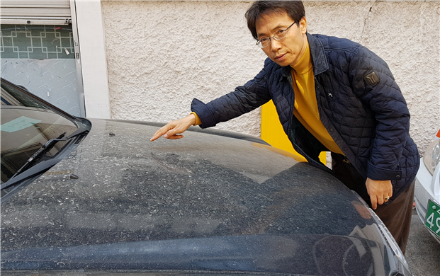 | ▲ 김광수(바른미래당·노원5) 서울시의원은 서울시가 미세먼지에 대해 보다 다양하고 적극적인 방향으로 대책을 모색해야 한다고 비판했다. 사진은 김 의원이 미세먼지 등으로 차체에 쌓인 먼지를 확인하며 미세먼지 심각성을 말하고 있는 모습. <사진제공=김광수 의원실> |