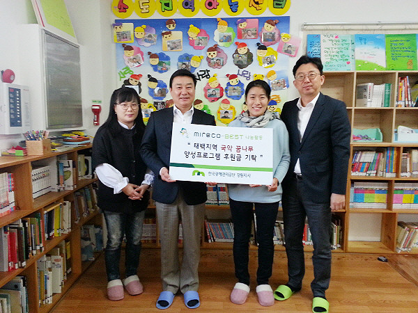 | ▲ 한국광해관리공단 강원지사 관계자들이 12일 태백시 문곡소도동 소도지역아동센터에서 국악 꿈나무 양성프로그램 후원금을 기탁한 후 기념촬영하고 있다.<사진제공=한국광해관리공단 강원지사> |