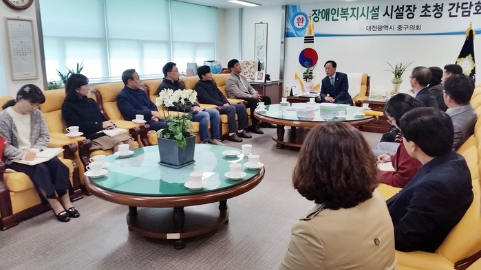 [세계로컬신문 오영균 기자]대전 중구의회 하재붕 의장이 9일 지역 장애인복지시설 시설장을 초청해 장애인 복지관련 애로사항 경청 등 대화의 시간을 가졌다.