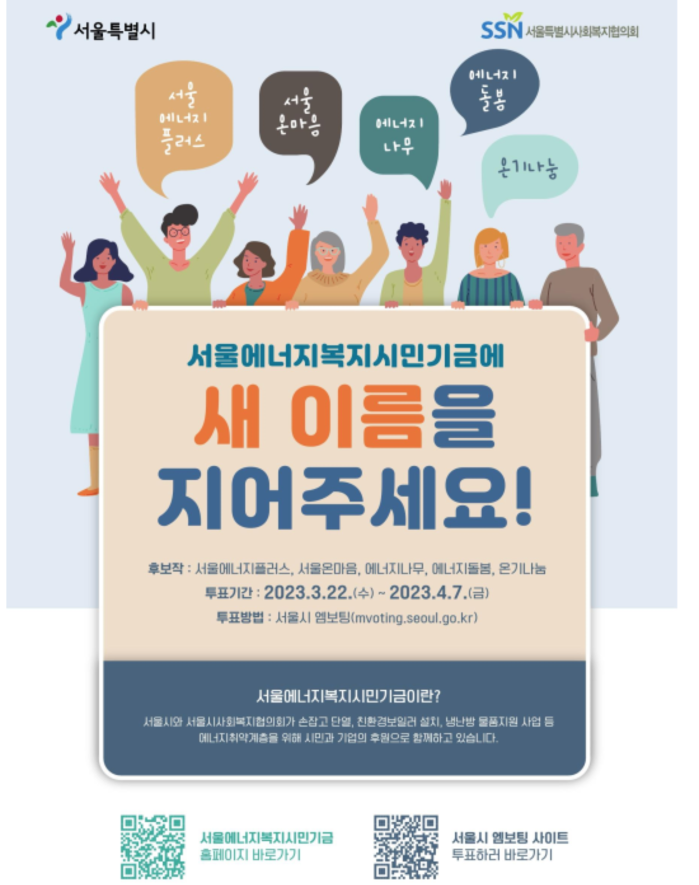 [세계로컬타임즈 이효진 기자] 서울시민이 직접 ‘서울에너지복지시민기금’의 새 이름을 뽑는 온라인 투표가 실시된다.