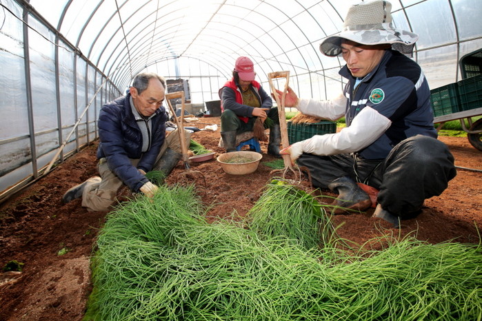 | ▲ 당진지역 농민들이 친환경적으로 재배한 달래를 출하하기 위해 수확하고 있다.<사진제공=당진시청> |