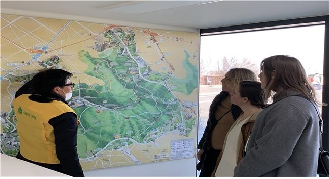 ▲ 남산을 방문한 외국인들에게 공원 안내를 하고 있다. (사진=서울시) |