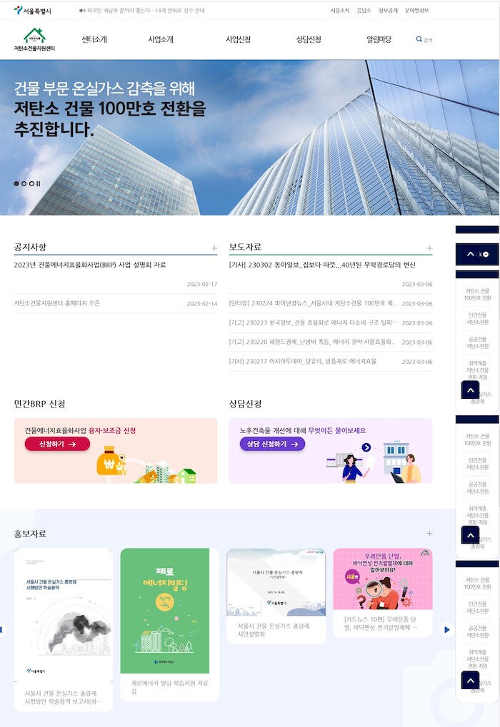 그동안 건물 온실가스 감축 정책에 대한 공식 누리집이 없어, 관련 정보를 얻으려면 서울시 누리집(홈페이지)에서 개별 사업 공고를 찾아야 하거나, 사업과 관련된 궁금증을 해소하려면 담당자와 직접 연락해야 하는 번거로움이 있었다.