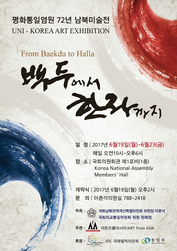 | ▲ 남북한 유명 작가 작품을 볼 수 있는 '백두에서 한라까지' 전시회 포스터. <사진제공=이춘석 의원실> |