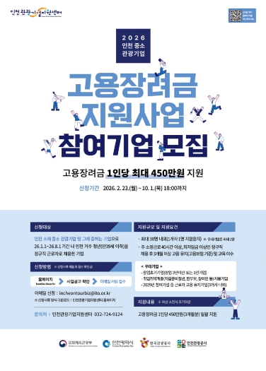 [세계로컬타임즈] 인천광역시와 인천관광공사(사장 유지상)는 지역 중·소 관광기업의 안정적인 인력 운영을 지원하고, 인천 거주 청년의 지속 가능한 일자리 창출을 위해'2026년 인천 중·소 관광기업 고용장려금 지원사업'을 추진한다고 밝혔다.