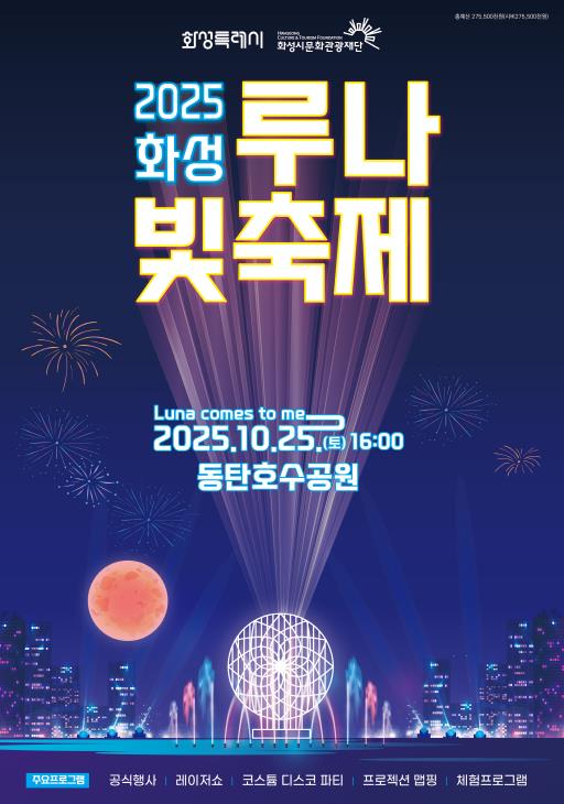 행사는 화성시 예술단의 오케스트라 공연으로 막을 올리고, 지역 예술단체들의 무대 공연과 함께 형형색색의 레이저 쇼가 호수공원의 밤하늘을 화려하게 수놓을 예정이다.