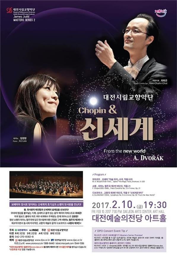 31일 대전시에 따르면 이번 공연은 연주자들에게 모차르트의 오페라 '마술 피리' 서곡, 작품 620부터 쇼팽의 '피아노 협주곡 제2번 바단조, 작품 21'과 드보르자크의 '교향곡 제9번 마단조, 작품 9 신세계로부터'를 선보인다.