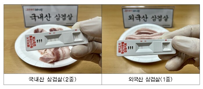 국내산 돼지는 백신접종으로 돼지열병 항체를 보유하고 있어 키트에 2줄로 표시되고, 항체가 없는 외국산 돼지는 1줄로 표시된다.