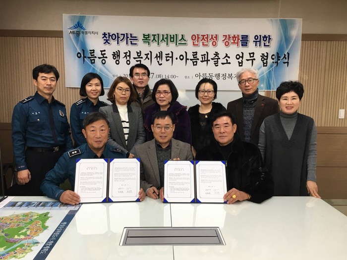 [세계로컬신문 온라인뉴스팀] 세종특별자치시 아름동 행정복지센터(동장 이광태)가 27일 찾아가는 복지서비스의 안전성 강화를 위한 아름동행정복지센터-아름파출소 업무협약(MOU)을 체결했다.