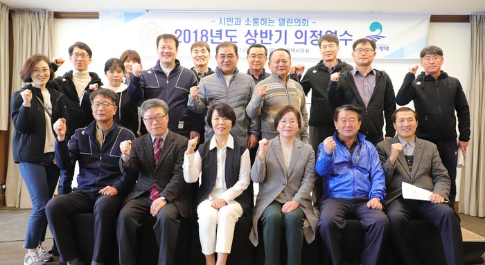 | ▲ 평택시의회 의원들과 사무국직원들이 연찬세미나에 참석해 파이팅 포즈를 취하고 있다. 평택시의회 제공 |