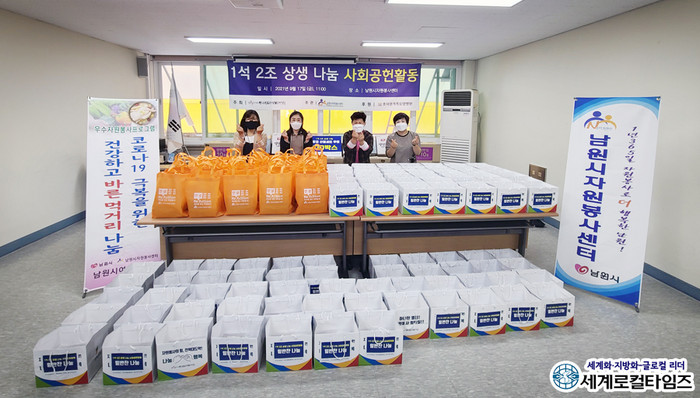 [세계로컬타임즈 조주연 기자] 전북 남원시자원봉사센터가 추석명절을 맞이해 취약계층 지원을 위한 ‘1석2조 상생나눔 사회공헌활동’을 가졌다.