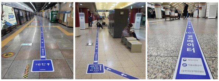 부착 대상 역은 어르신・휠체어 이용객 등 교통약자 및 환승인원이 많은 곳을 선정했으며, 휠체어를 이용해 역 바깥부터 열차 탑승・환승까지 실제 이동 가능한 동선을 선정해 띠를 부착했다.