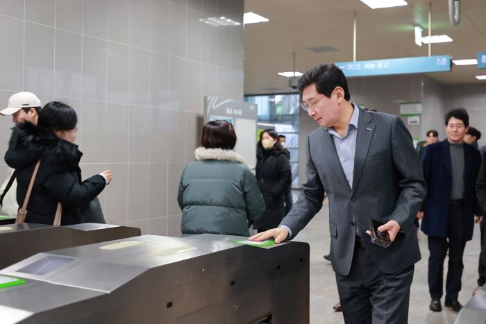 이 시장은 시청행 경전철을 타기 위해 승강장으로 이동하면서 시민들이나 경전철 운영사 직원들과 일일이 악수를 하며 새해 덕담을 나눴다.