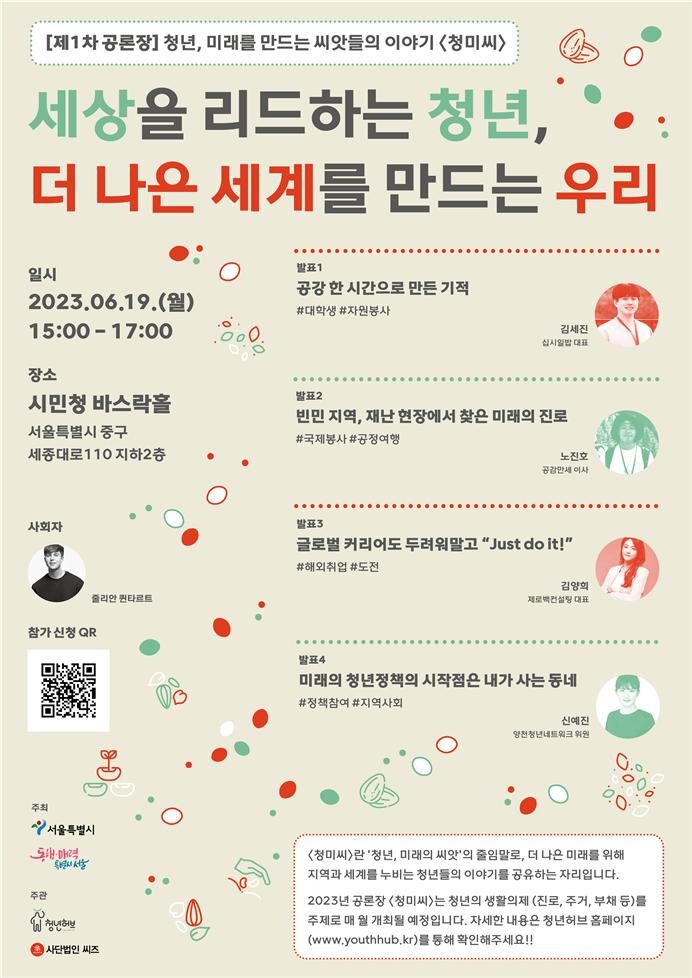 [세계로컬타임즈 이효진 기자] 서울특별시 청년허브가 다양한 사회문제를 해결하고 미래를 개척해 나가고 있는 청년들의 활동을 소개하고, 해결방안을 함께 모색하는 청년 공론장 ‘청년, 미래의 씨앗(청미씨)’를 개최한다.