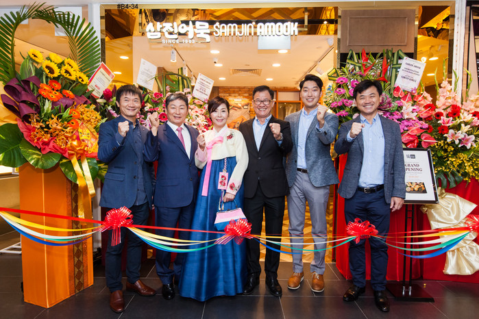 | ▲ 삼진어묵의 싱가포르 해외 1호점 진출과 관련 비첸향 리차드 웡텐산 대표(왼쪽 네번째)와 삼진식품 박종수 대표(왼쪽 두번째), 삼진어묵 박용준 대표(오른쪽 두번째)가 삼진어묵 싱가포르점 오픈을 축하하고 있다.<사진제공=삼진어묵> |
