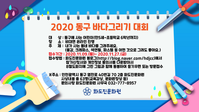 인천 동구는 화도진문화원이 바다 그리기 대회는 코로나19로 인해 현장에서 대회 진행을 하지 않고, 각자의 작품을 방문이나 등기우편을 통해 접수하는 공모전 형식으로 진행된다.