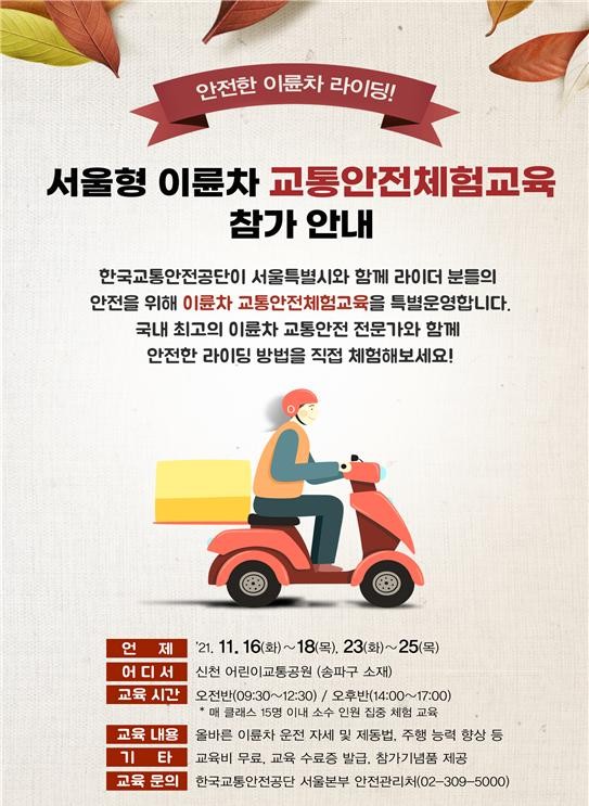 서울시와 한국교통안전공단은 오는 25일까지 매주 화요일~목요일에 ‘서울형 이륜차 교통안전체험교육’을 신천어린이교통공원(송파구 신천동 소재) 실시한다.
