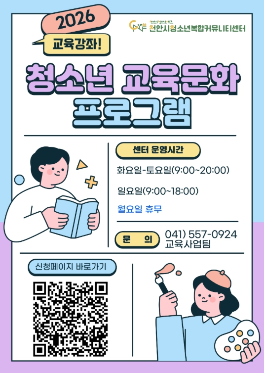 자세한 문의는 천안시청소년복합커뮤니티센터 교육사업팀으로 하면 된다.