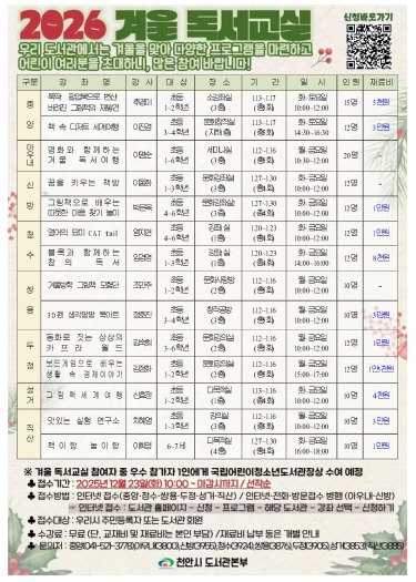 겨울 독서교실은 천안시 8개 공공도서관에서 운영되며, 독서활동과 함께 요리체험, 창작활동 등 다양한 프로그램이 진행될 예정이다.