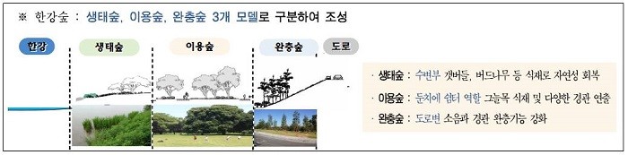 한강숲 조성사업은 한강의 숲을 기능별로 3가지 모델(완충숲, 이용숲, 생태숲)로 구분해 각 위치의 특성에 맞는 숲으로 조성한다.
