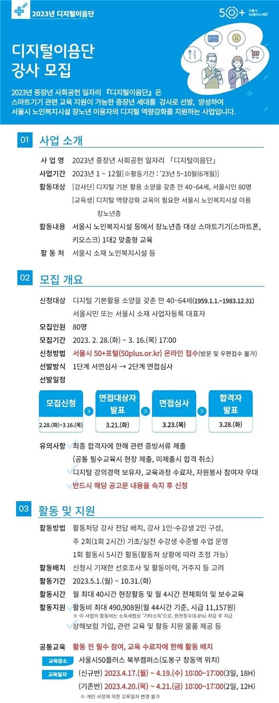 28일부터 3월 16일까지 50+포털을 통해 지원할 수 있으며, 최종 합격자는 3월 28일 50+포털을 통해 발표한다.