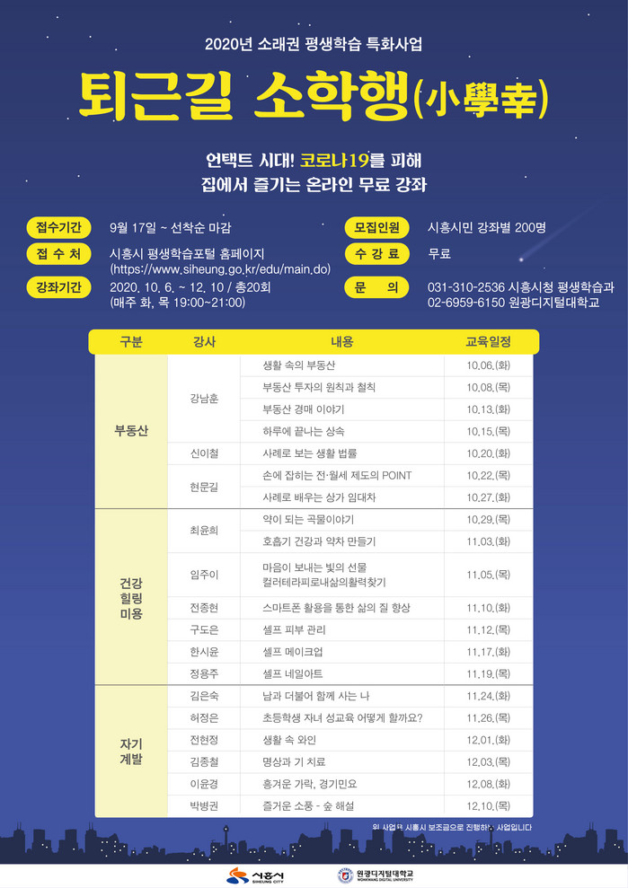 올해 처음 운영되는 ‘퇴근길 소학행(小學幸)’은 원광디지털대학교 교수진과 건강·힐링·미용, 자기계발, 부동산 등 다양한 분야별 전문가들이 진행하는 강의로 구성돼 있다.