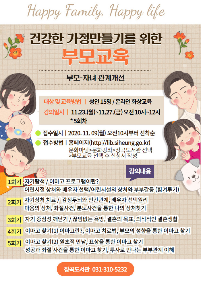 교육 참여를 원하는 사람은 내달 9일 시흥시 중앙도서관 홈페이지 문화마당 탭의 문화강좌 코너에서 장곡도서관 부모교육을 선택한 후 신청서를 작성하면 교육 참여가 가능하다.