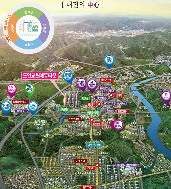 또한 도안신도시와 인접해 신도시의 편리한 생활 인프라를 모두 누릴 수 있다. 홈플러스, 하나로마트, 이마트 등 대형마트는 물론, CGV, 갤러리아백화점, 롯데백화점, 건양대병원, 유성구청, 대전시립박물관 등 다양한 생활 인프라가 밀집해 있다.