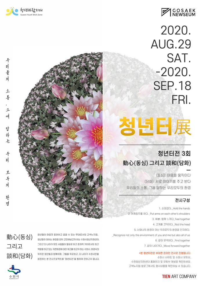 4일 수원시에 따르면 오는 11일 열리는 ‘청년터전(展) 온라인 전시회’는 지역 청년들이 기획·준비한 전시로, 코로나19 확산 방지를 위해 비대면 온라인 방식으로 진행된다. 수원시청년지원센터 및 수원시 홈페이지, 수원시 유튜브 채널에서 전시 영상을 볼 수 있다.