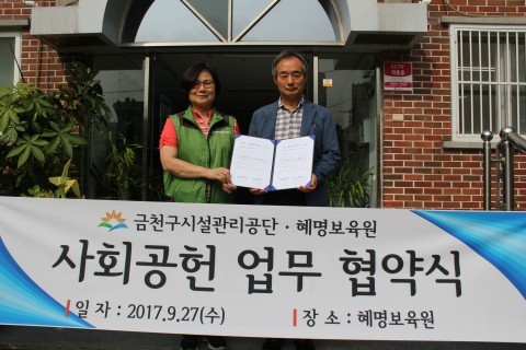 [세계로컬신문 김수진 기자] 서울시 금천구 시설관리공단(이사장 문길수)은 지난 27일 사회공헌활동 협조 목적으로 사회적 가치를 지향하는 관내 기관인 혜명보육원과 업무 협약을 체결했다고 29일 밝혔다.