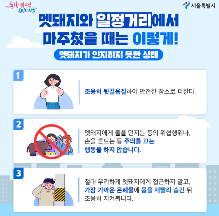 이에 야생멧돼지와 마주칠 경우 당황하지 않고 피할 수 있도록 상황별 행동요령 홍보물(리플릿)을 제작해 야생멧돼지가 출몰하는 12개 구에 배포하고 시공원 및 서울시 공식블로그에 관련 내용을 게시했다.