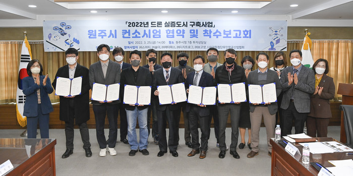 [세계로컬타임즈 김재민 기자] 원주시는 ‘2022년 드론 실증도시 구축사업’의 추진을 위해 지난 25일 원주시청에서 사업수행 참여 사업자인 스마티, 솔더, 메타 파스, 디지트 로그, 보고 넷, 강원첨단무인항공산업협회와 협약을 체결하고 착수보고회를 마쳤다.