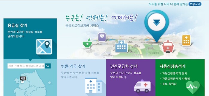 스마트폰 앱은 ‘응급의료정보제공(e-gen)’을 통해 알 수 있다.