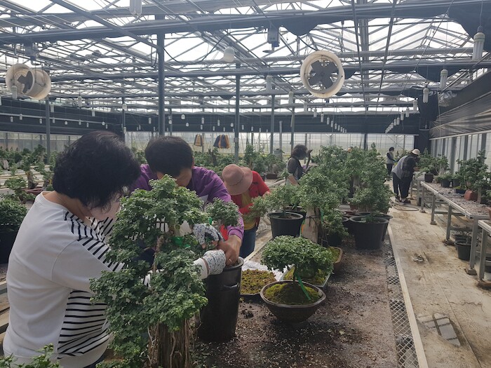 | ▲작품국화 학습단체 회원이 국화분재를 손질하고 있다.(사진=화순군) |