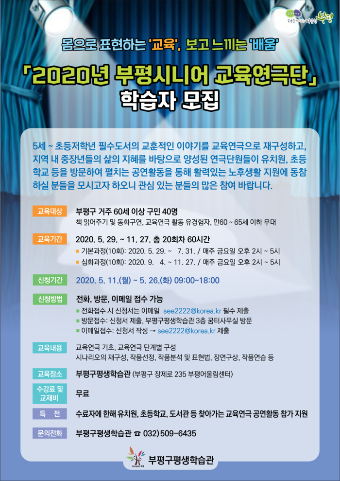 | ▲ '2020년 부평시니어 교육연극단' 학습자 모집 안내 포스터. (사진=부평구 제공) |
