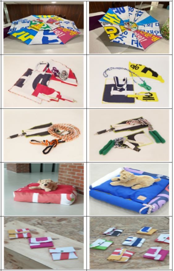 폐현수막을 꼬아서 만든 현수막줄넘기, 반려동물 침대와 베개, 소지품을 담을 수 있는 멀티파우치를 제작했다.