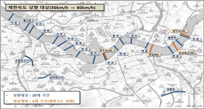 다만, 한강교량 중 자동차전용도로인 청담대교(제한속도 시속 80km)와 잠수교, 광진교, 잠실철교 측도 등 시속 40km 이하인 교량만 제한속도 조정대상에서 제외돼 기존의 제한속도가 유지된다.