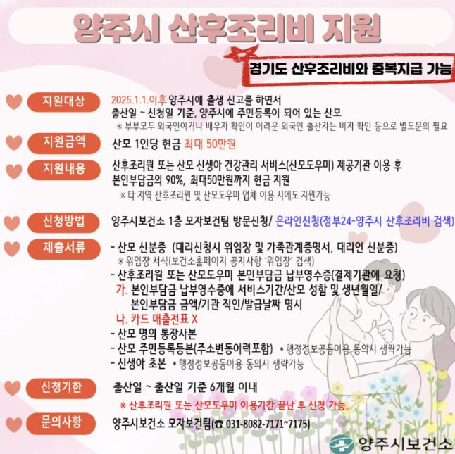 양주시보건소 관계자는 “출산 가정의 경제적 부담을 완화하고 안정적인 산후 회복을 돕기 위해 마련한 사업”이라며 “많은 출산가정이 제도를 활용해 실질적인 도움을 받길 바란다”고 말했다.