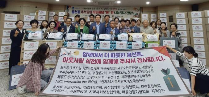 [세계로컬타임즈] 수원시 장안구 율천동은 지난 29일, 추석명절을 맞이하여 관내 어려운 이웃에게 따뜻한 나눔을 전하고자 우리동네 ‘찐’한 나눔행사 전달식을 개최했다.