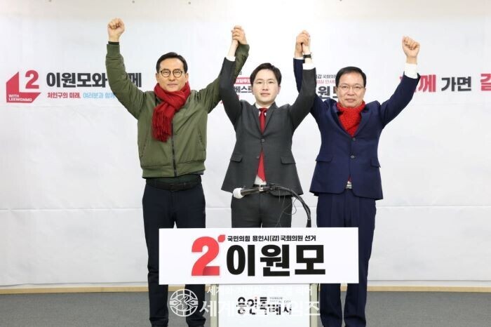 ▲ 용인에서 용인을을 제외하고 나머지 공천이 확정된 국민의힘 예비후보들이 손을 맞잡고 총선에서의 선전을 다짐했다. 왼쪽부터 강철호(용인정), 이원모(용인갑), 고석(용인병) 예비후보 (사진=시민 제공) |