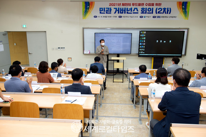 [세계로컬타임즈 김병호 기자]제천시가 지난 8월 30일 세명대학교 학술관에서 이상천 시장과 배동만 시의회 의장, 먹거리 준비위원 등 30여명이 참석한 가운데 푸드플랜 수립을 위한 민관 거버넌스 2차 회의를 개최했다.