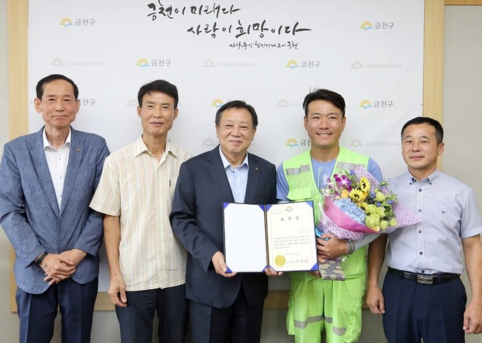 [세계로컬신문 김수진 기자] 서울시 금천구가 지난 7일 업무 수행 중 범죄자 체포에 결정적 기여를 한 환경미화원 안상호(49)씨에게 표창장을 수여했다.