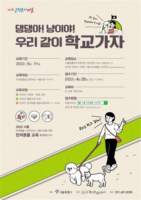 모든 교육과정은 무료로, 신청은 25일부터 ‘서울 반려동물 시민학교’ 누리집에서 할 수 있으며 선착순으로 마감된다.