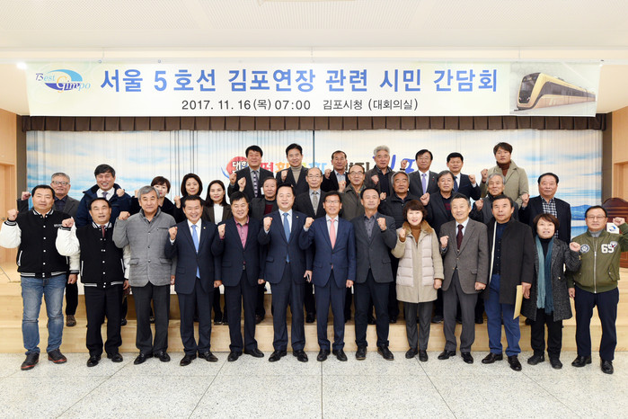 | ▲ 지난 16일 서울지하철 5호선 김포연장 범시민추진위원회 회원들이 기념촬영을 하고있다.<사진제공=김포시청> |