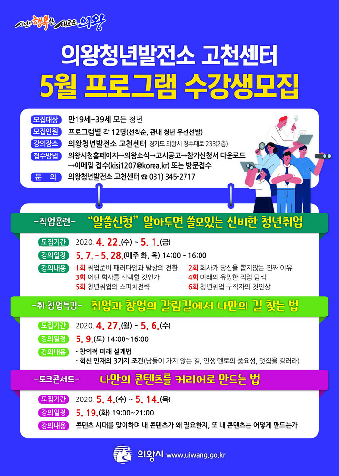 [세계로컬타임즈 최성우 기자] 의왕시는 의왕 청년발전소 고천센터에서 ‘취업과 창업의 갈림길에서 나만의 길 찾는 법’ 직업훈련 프로그램을 5월 9일 실시할 방침이다.